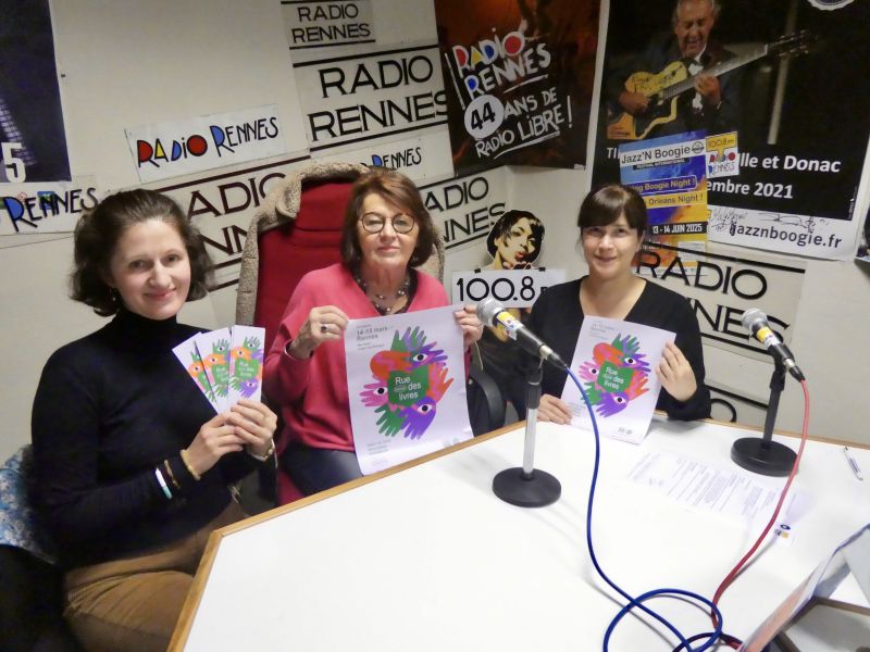 Elisabeth Lemau, présidente, Margot Bougeard, directrice, et Emilie Collet, médiatrice et programmatrice jeunesse de l’association Rue des livres, nous présentent la 18ème édition du festival Rue des Livres qui aura lieu le week-end des 14 et 15 mars aux Cadets de Bretagne.