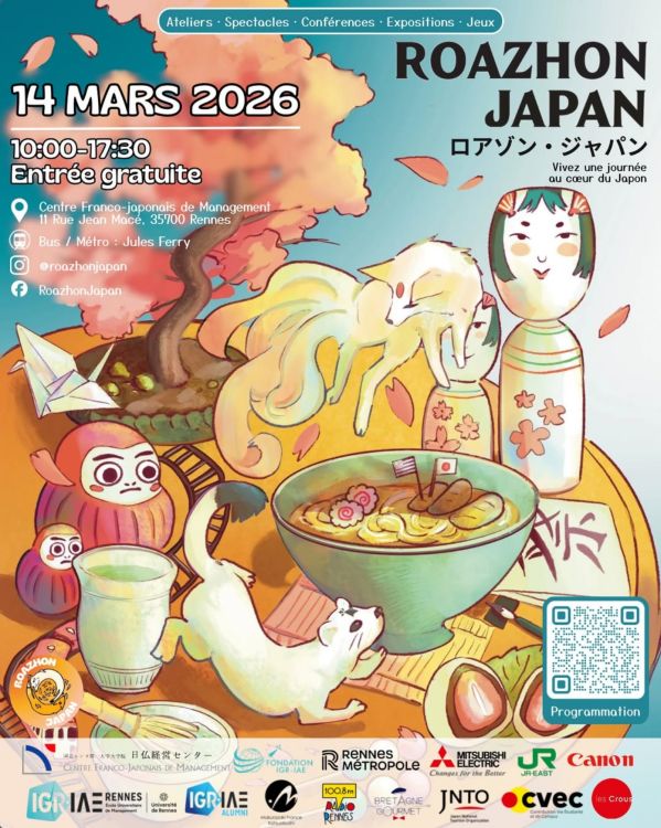 Les étudiants de l’association ACECFJM, créée par le Centre Franco-Japonais de Management de l’IGR-IAE de Rennes, sont fiers de vous annoncer le retour de leur événement annuel Roazhon Japan pour sa sixième édition, le samedi 14 mars 2026, de 10h à 17h30 dans les locaux de l’IGR-IAE de Rennes.