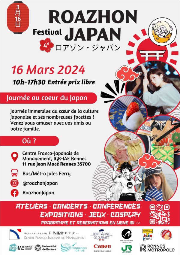 Les étudiants de l’association ACECFJM, créée par le Centre Franco-Japonais de Management de l’IGR-IAE de Rennes, sont fiers de vous annoncer le retour de leur événement annuel Roazhon Japan pour sa quatrième édition, le samedi 16 mars 2024.